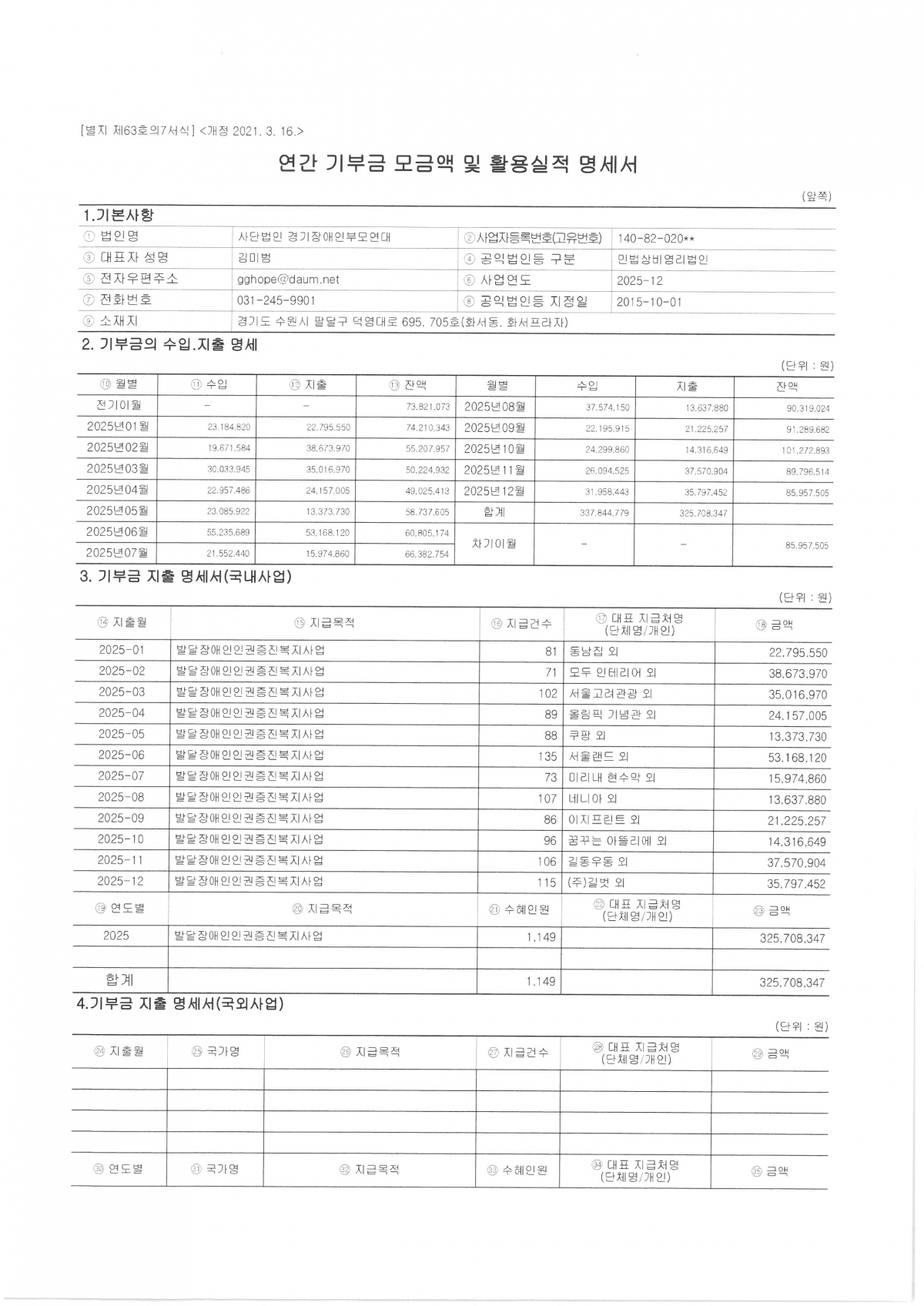 2025년 연간 기부금 모금액 및 활용실적 명세서